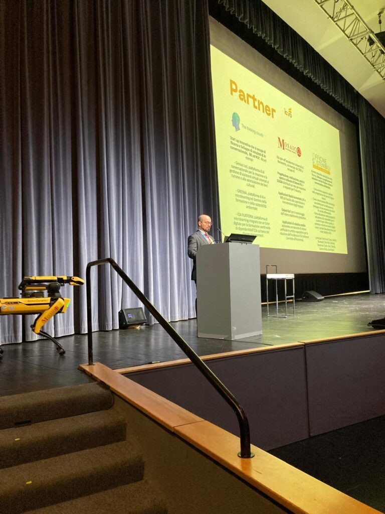 Today, the spotlight is on SPOT, the famous Boston Dynamics robot dog, programmed by partners at Mosaico Controllo Integrato. Its presence at the fair marks a key moment for ICARO, the research and development project funded by MICS under the PNRR โ NextGenerationEU.
